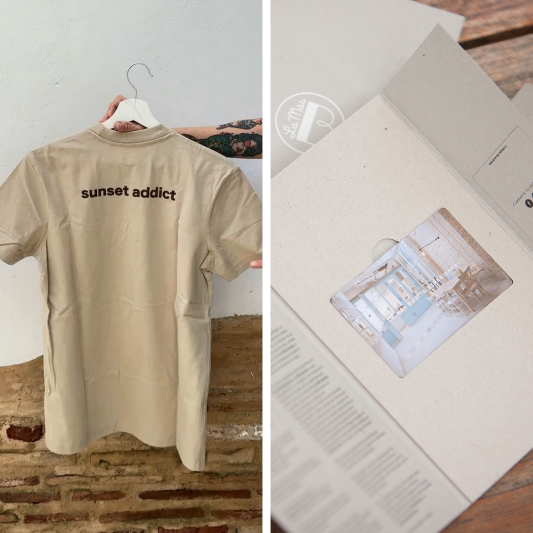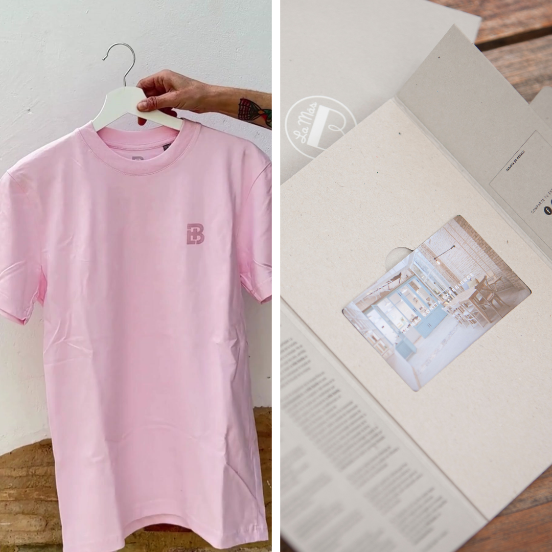 El pack Momento LMB incluye una camiseta de la colección Merch La Más Bonita y una tarjeta regalo de 20€ para disfrutar en nuestros locales (LMB Patacona y LMB Ruzafa)